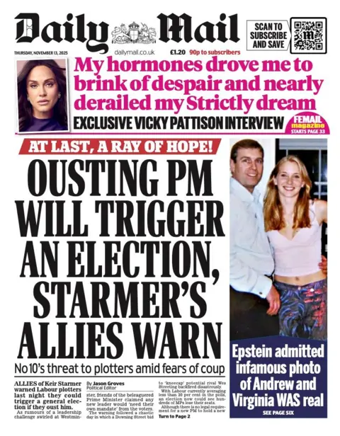 The Daily Mail has a warning of potential “Labour Plotters” from the PM’s allies. Those close to Sir Keir say any plans to oust him could prompt a general election, the paper reports. “Finally, a ray of hope!” declares a Sardonic Mail Sub-Hearline.