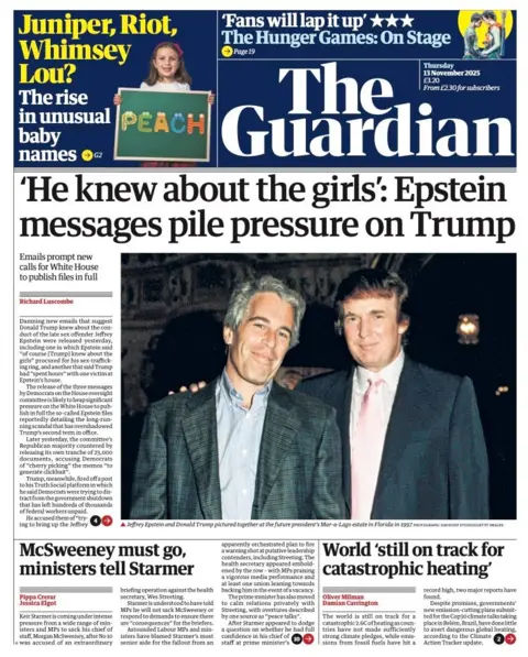 The newly released emails that suggest Donald Trump about the conduct of the late sex Jeffrey Epstein Dominate the papers on Thursday. “He knows about girls” is the headline of the Guardian, quoting from one of the messages released by the Democrats in the House Committee. The email is one of three published exchanges containing allegations that the US president knew about Epstein’s activities. Trump has always denied any wrongdoing with Epstein.